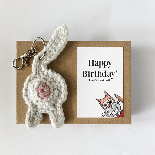 Hand Drawn Birthday Card Personalized Message Birthday Crocheted Cat Butt Keychain or Ornament