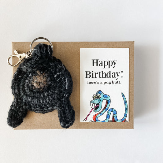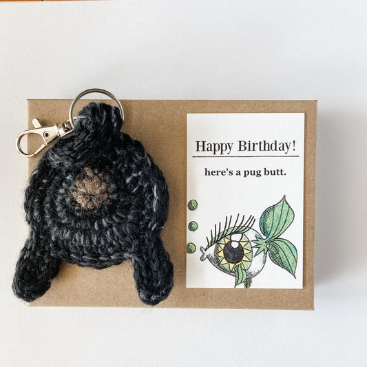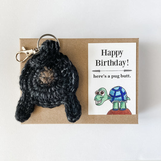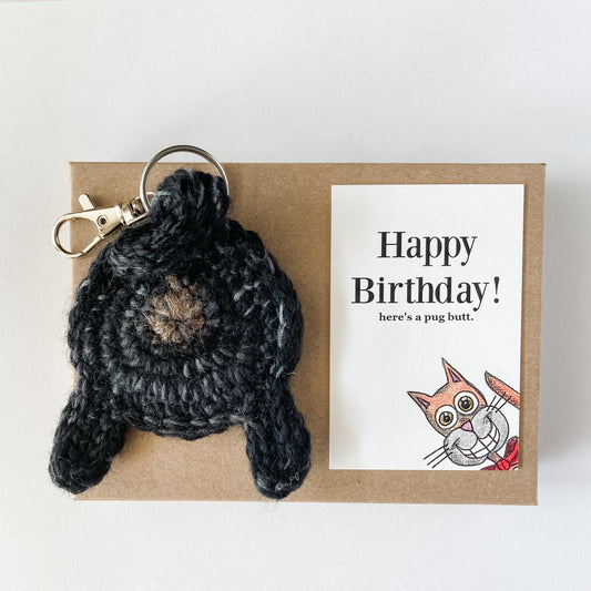Black Pug Butt Keychain Funny Birthday Gift with Novelty Card