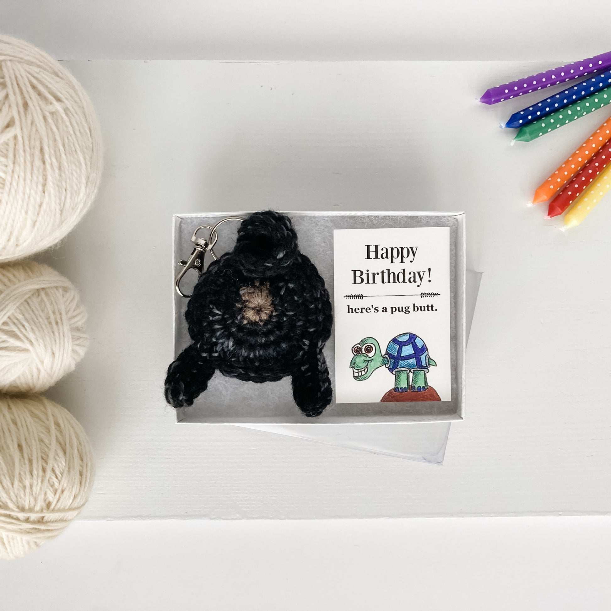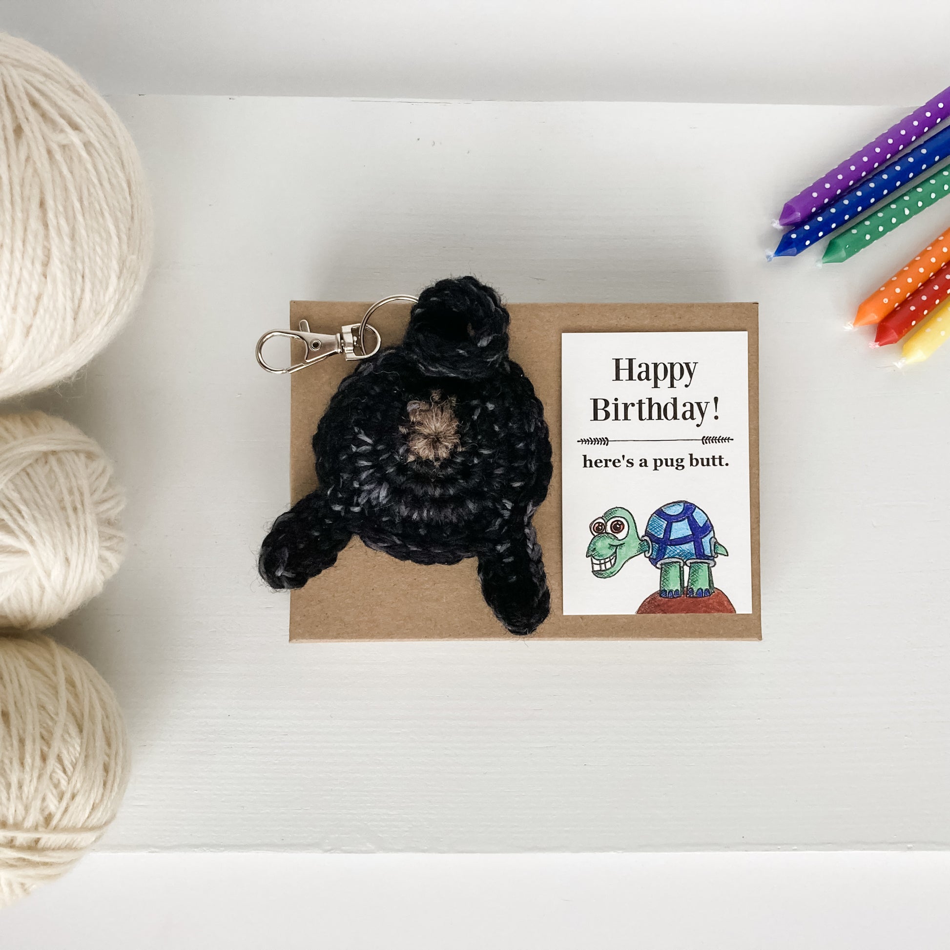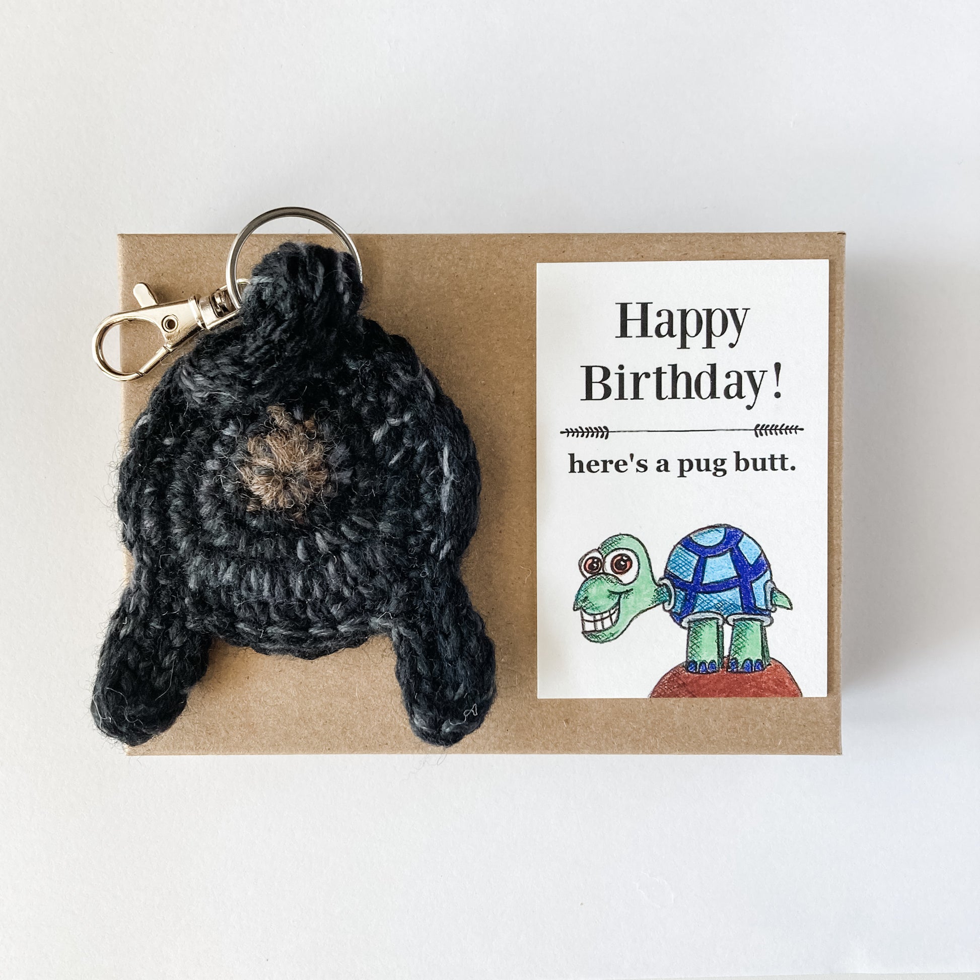 This funny birthday gift set includes one black pug butt keychain and a hilarious birthday collectible art card. You're making an awesome birthday gift decision and bringing a little silliness (and affection) to someone you love.