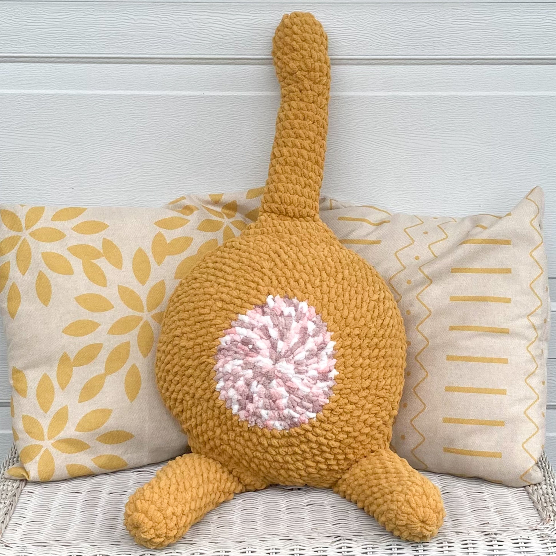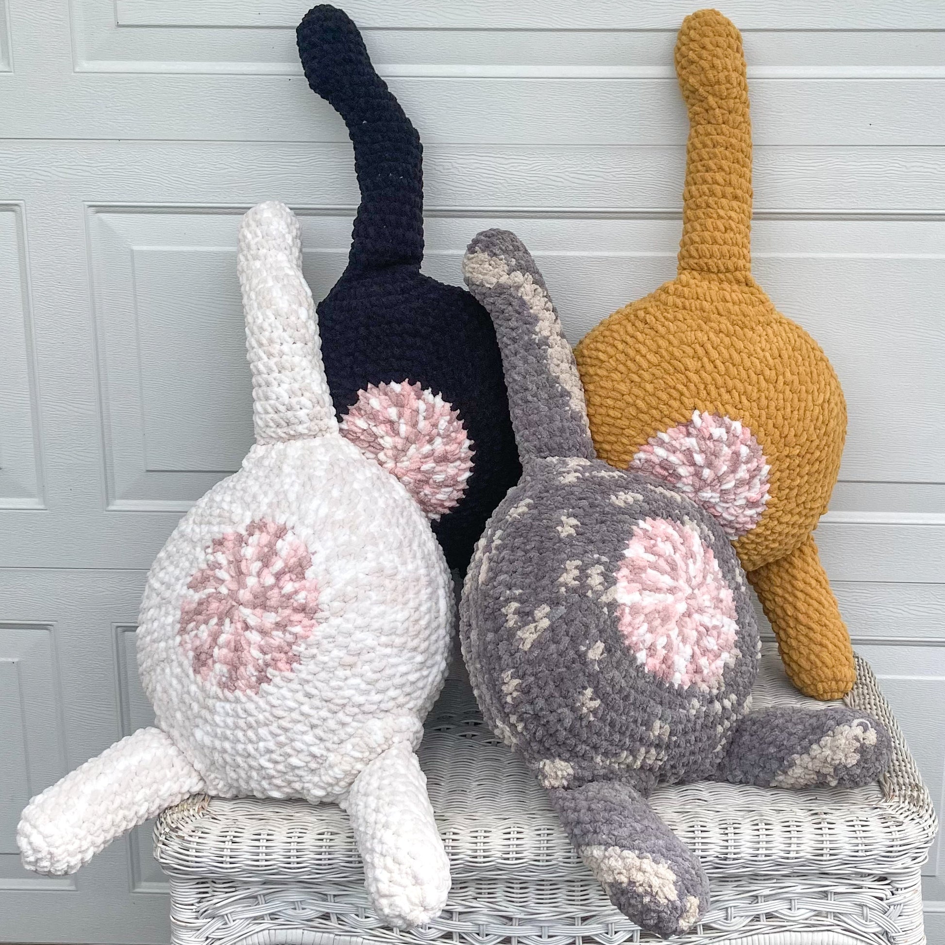 - Each cat butt pillow is crocheted from soft 100% polyester blanket yarn. Its tail and legs are stuffed with polyester fiberfill, and needle stitched securely into place. The cat butt is filled with an 18" polyester pillow insert.