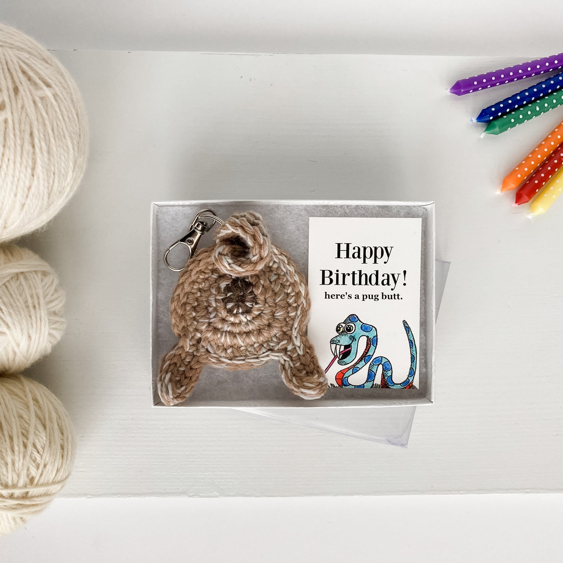 This funny birthday gift set includes one fawn (beige) pug butt keychain and a hilarious birthday collectible art card. You're making an awesome birthday gift decision and bringing a little silliness (and affection) to someone you love.