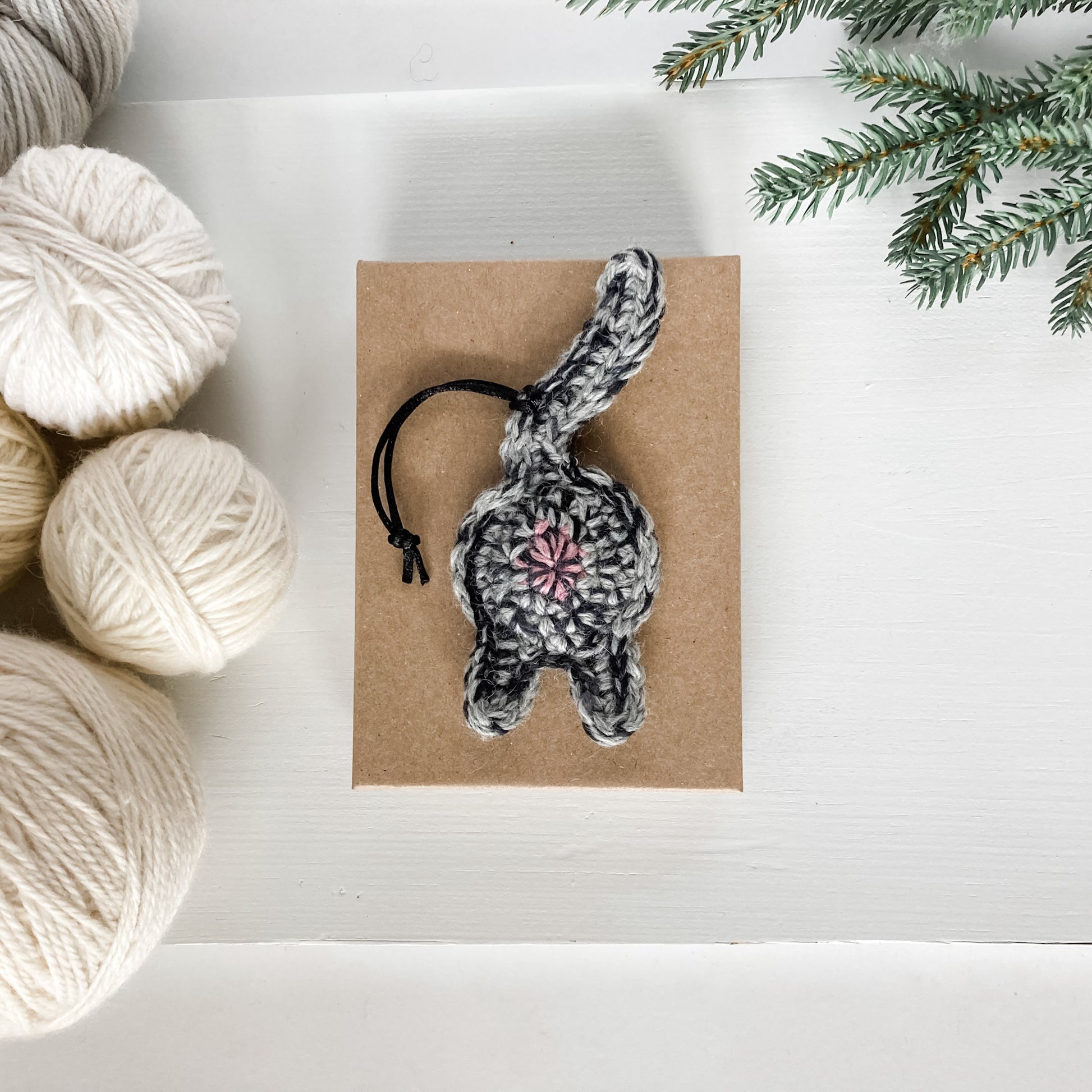 - The gray tabby cat butt is hand crocheted out of luxurious 100% wool in a variety of yarn weights to create depth and texture.