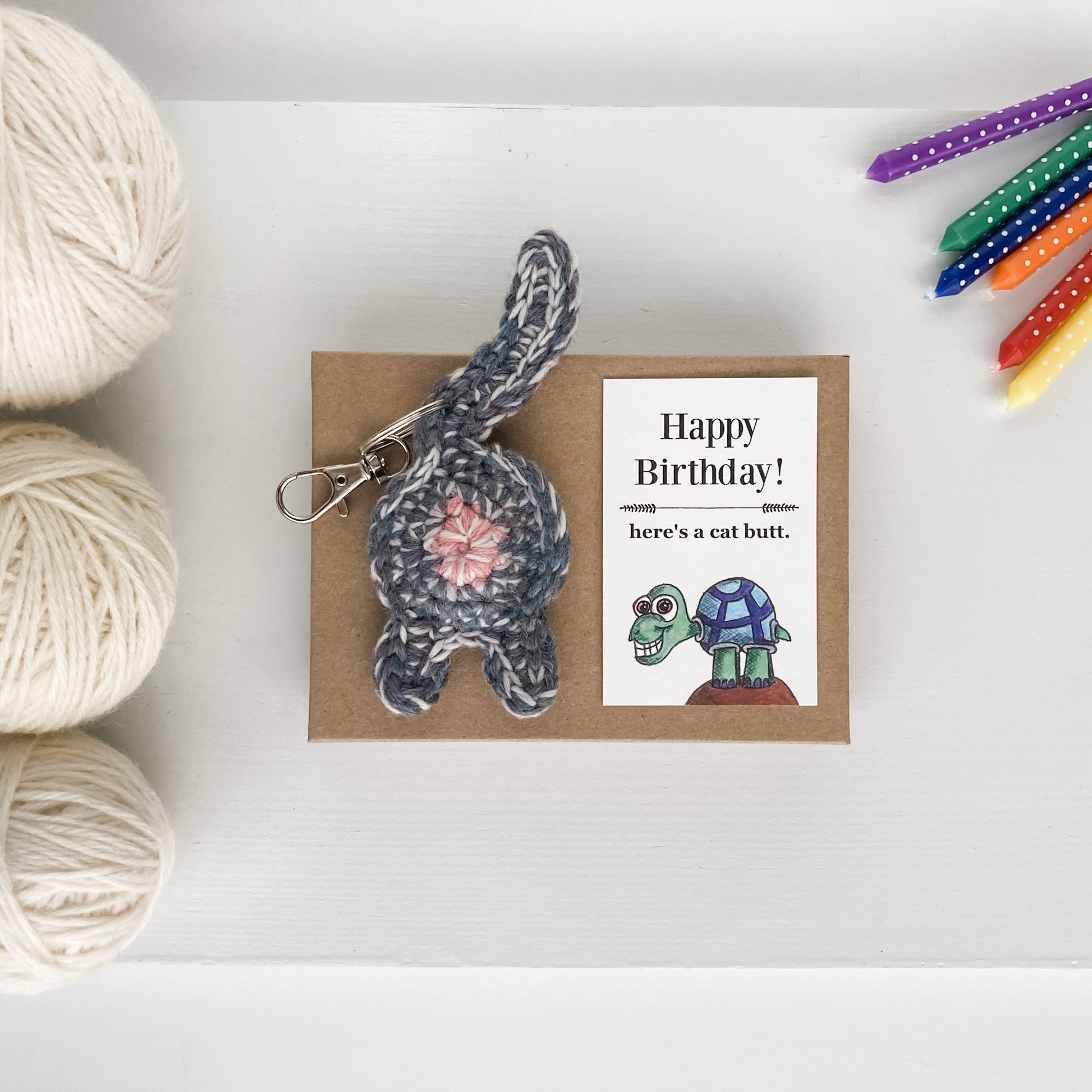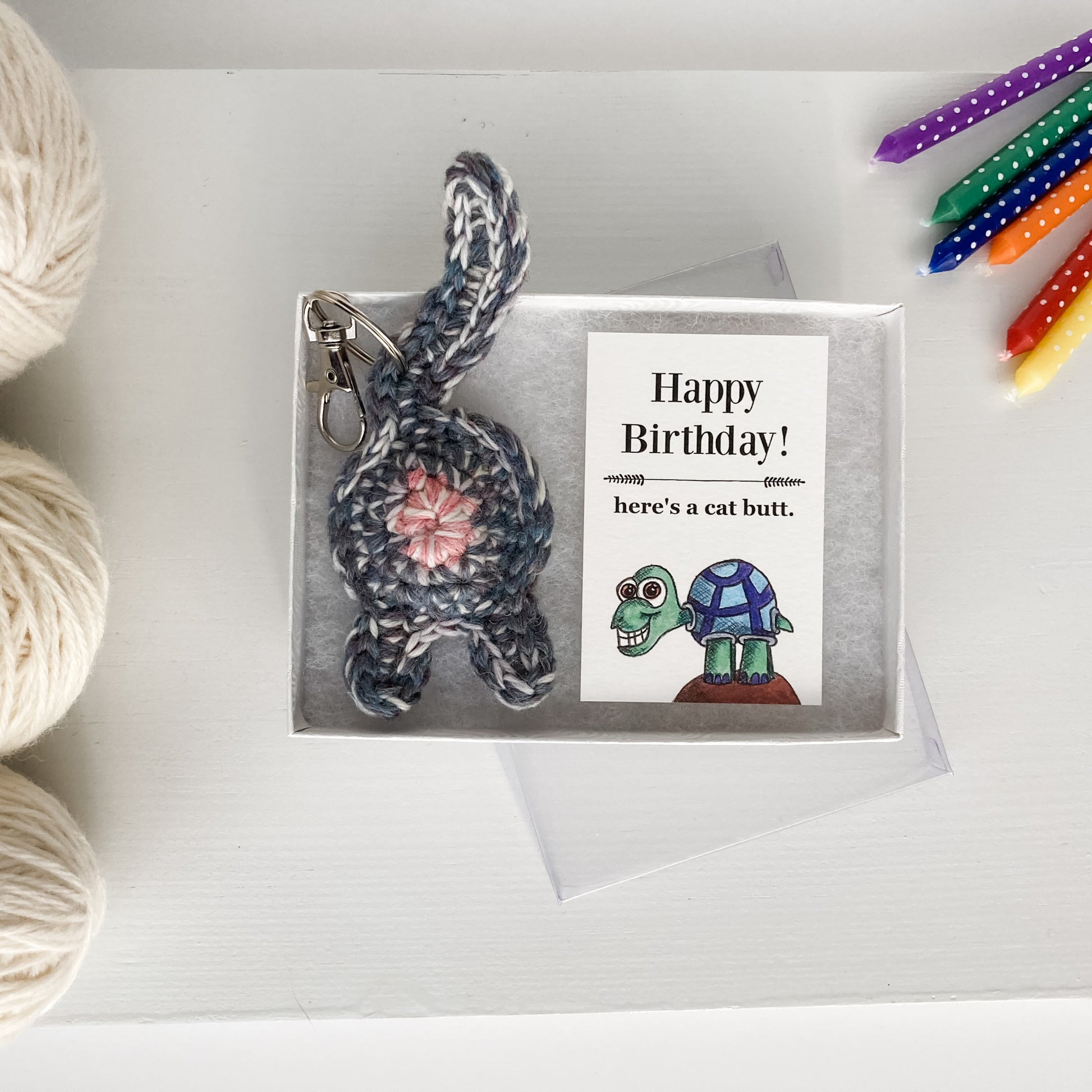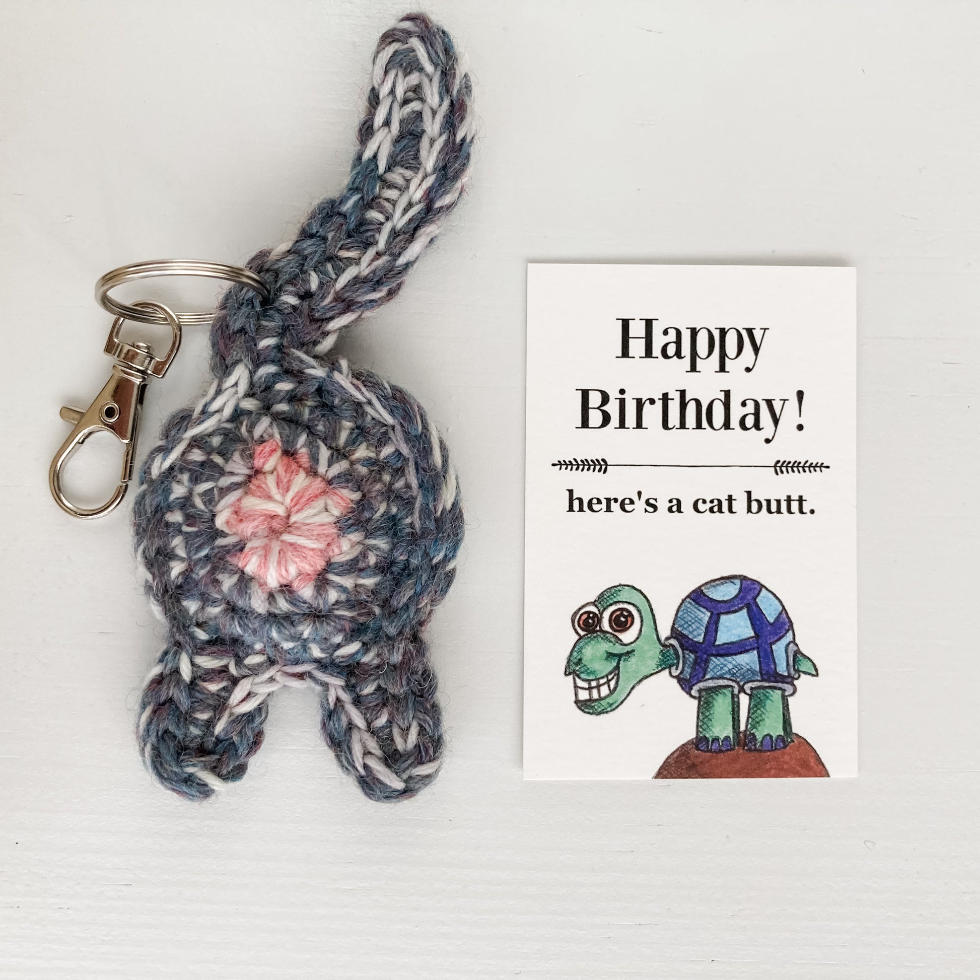 This hilarious birthday gift set includes one gray purple cat butt keychain and a hilarious birthday collectible art card. You're making an awesome birthday gift decision and bringing a little silliness (and affection) to someone you love.