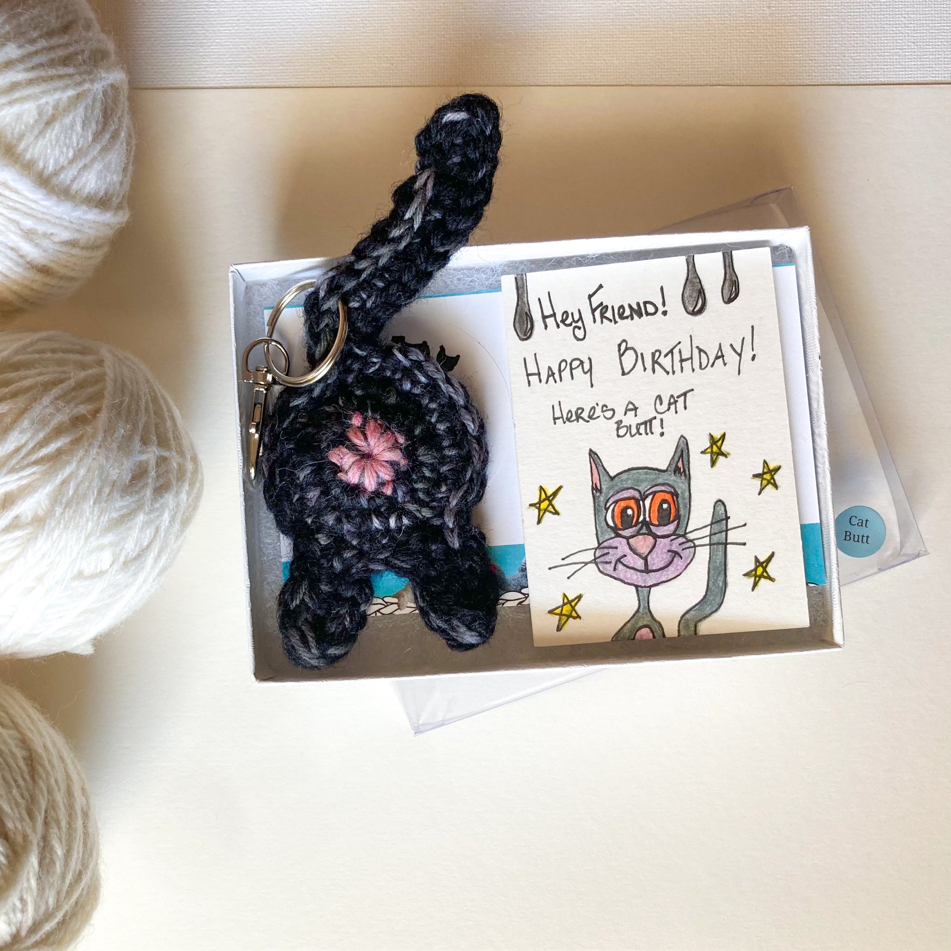 Hand Drawn Art Card Personalized Message Birthday Crocheted Cat Butt Keychain or Ornament