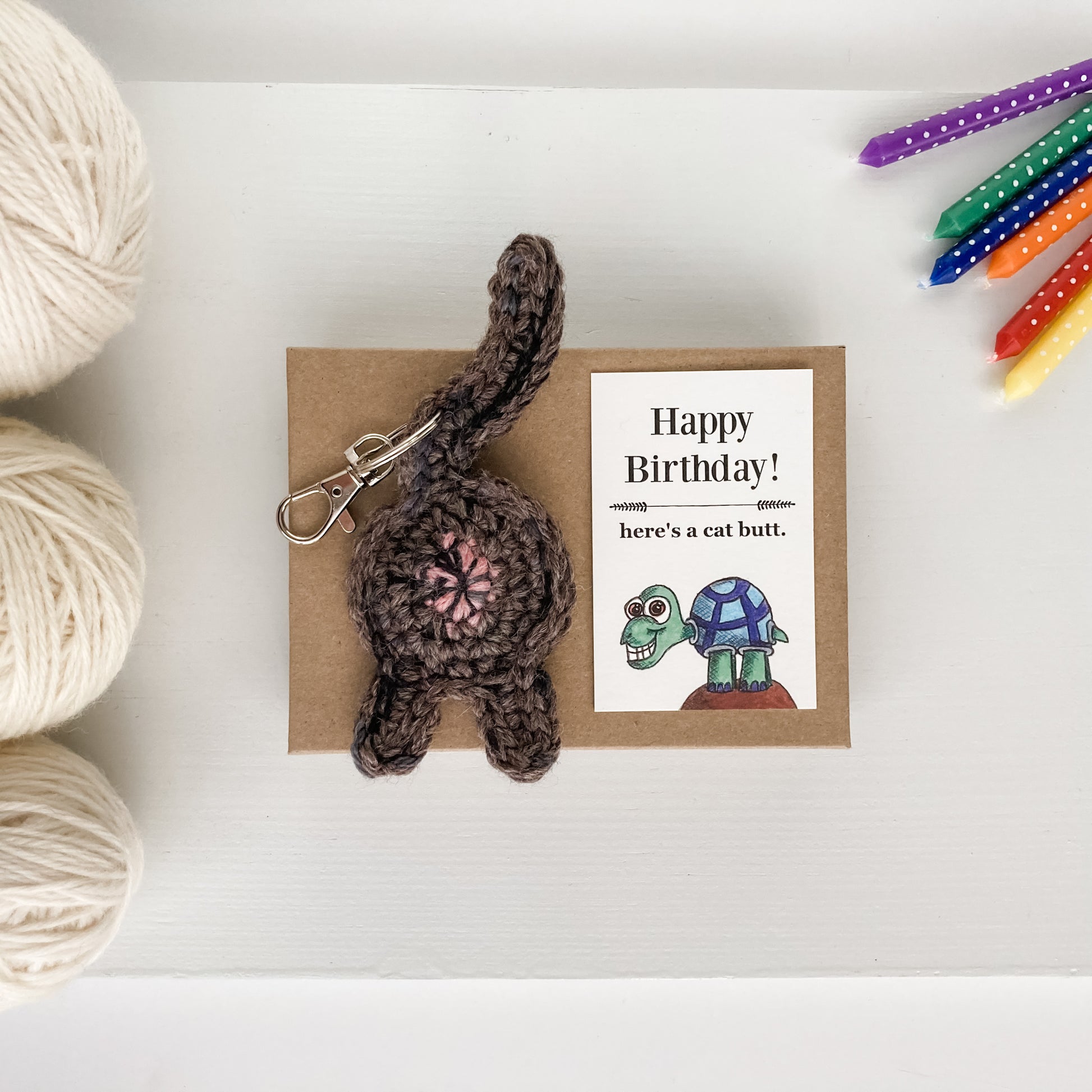 Want the best birthday gift idea for your cat lover? Show your affection with this brown torti cat butt keychain and birthday card. Just like a cat!