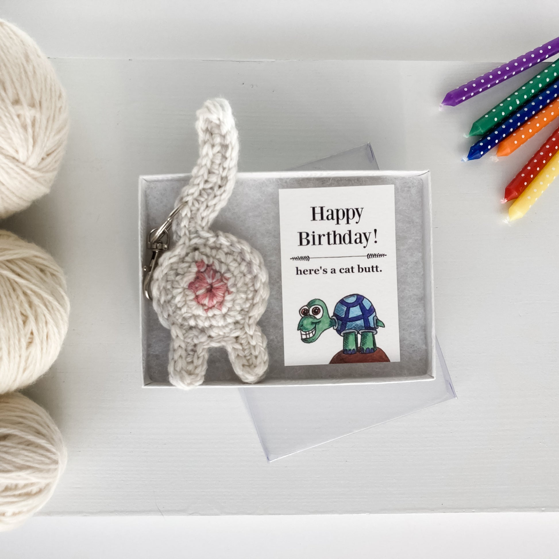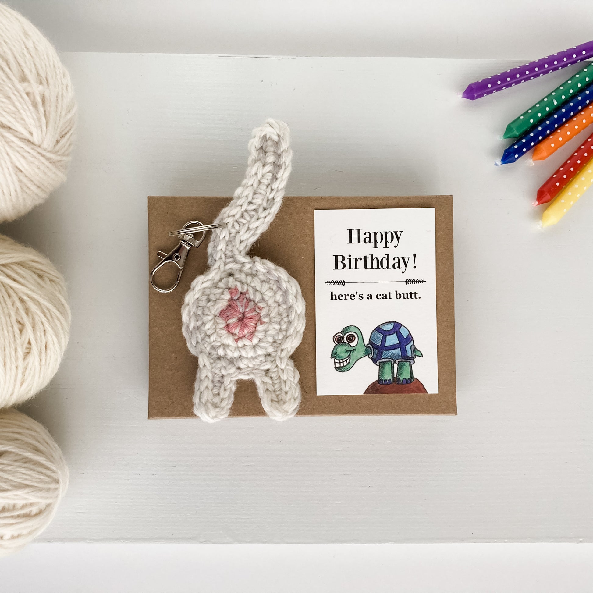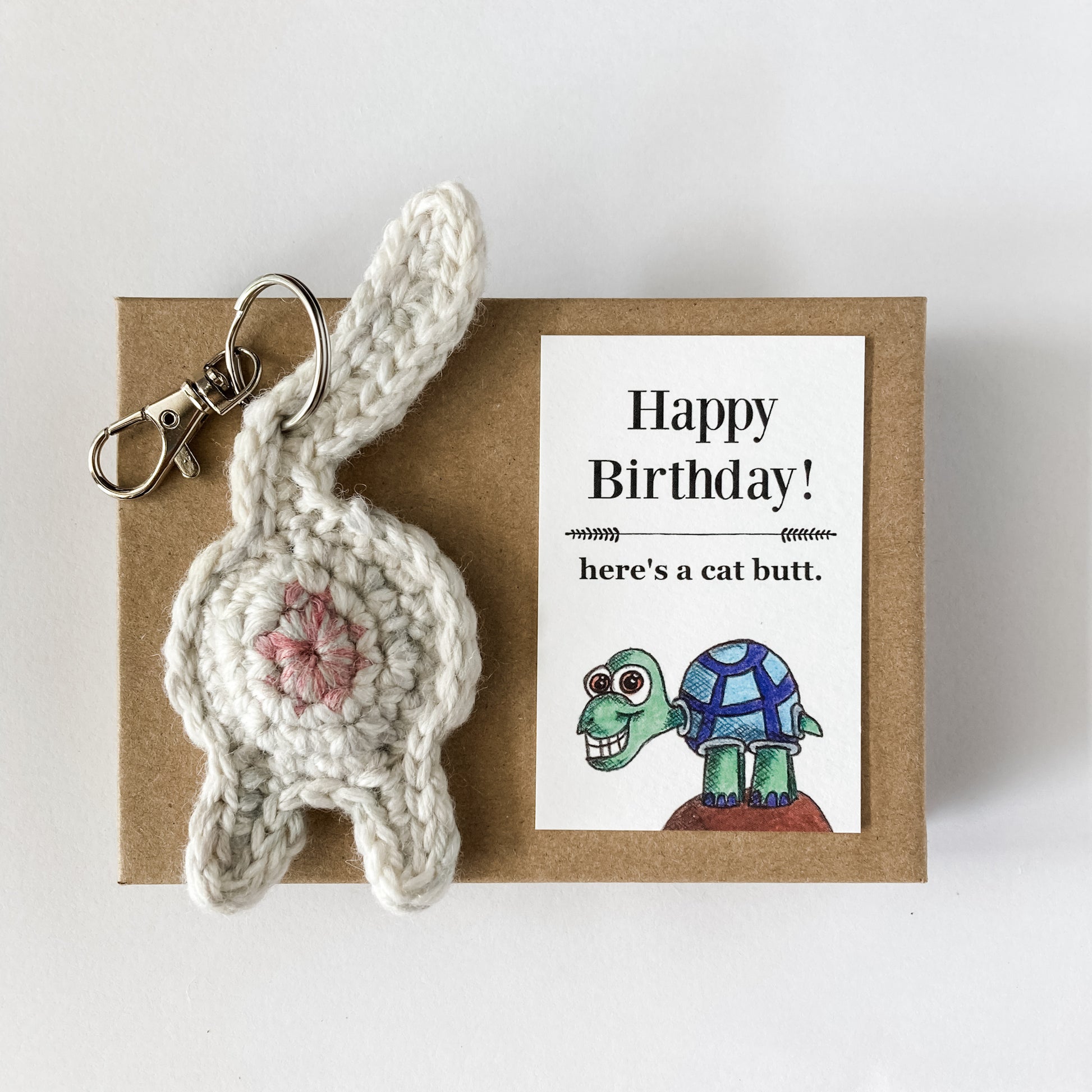 Want the best birthday gift idea for her, or even for any cat lover? Show your affection with this white cat butt keychain and birthday card. Just like a cat!