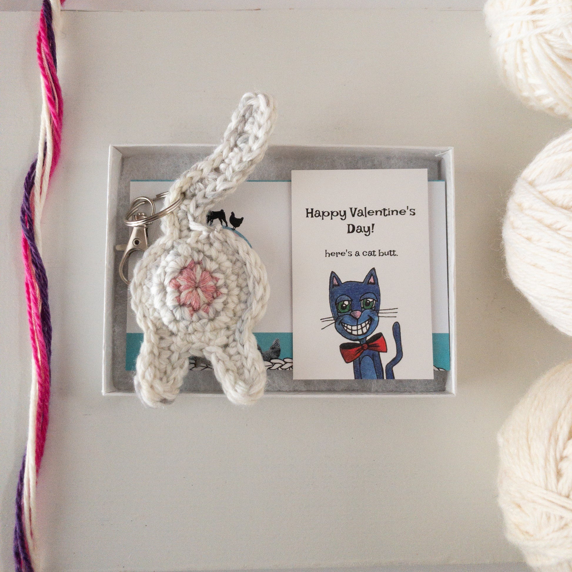 WHITE CAT BUTT KEYCHAIN WITH VALENTINE'S DAY CARD